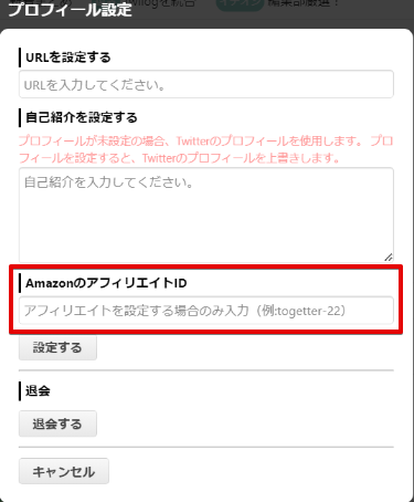 表示された「プロフィール設定」画面内、「AmazonのアフィリエイトID」欄にご自分のIDを設定します。(AmazonアフィリエイトIDの取得方法などはこちらをご覧ください。)