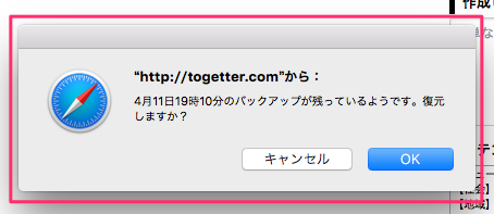 バックアップを復元したい場合、改めてまとめ作成画面を開くと、下図のようなダイアログボックスが表示されますので、「OK」をクリックしてください。