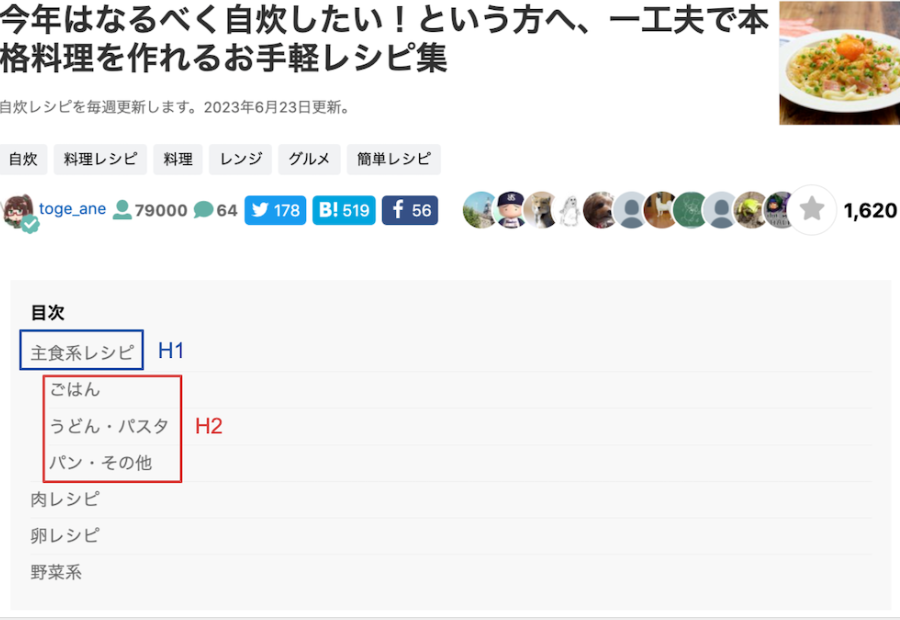 設定した目次はまとめ右上のメニューボタンや、各H1見出しの右側のノートアイコンをクリックすることで確認できます。