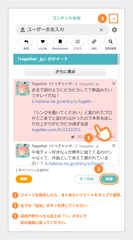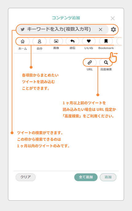 ポスト(ツイート)などのコンテンツが追加できます。詳細は「ポスト(ツイート)を取得する(スマホ)」や「リンクや画像・動画などを追加する」ご確認ください。
