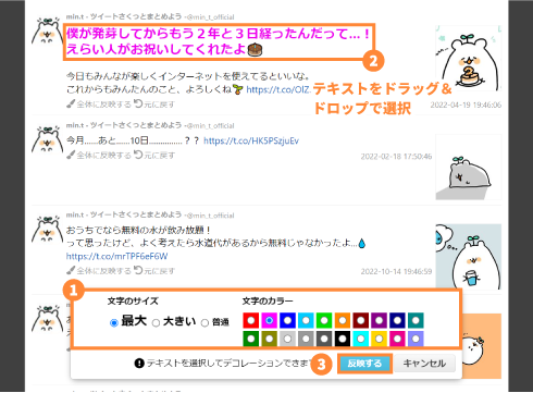 - 全体に反映する…そのポスト(ツイート)の全てのテキストが選択した色・サイズでデコレーションされます。