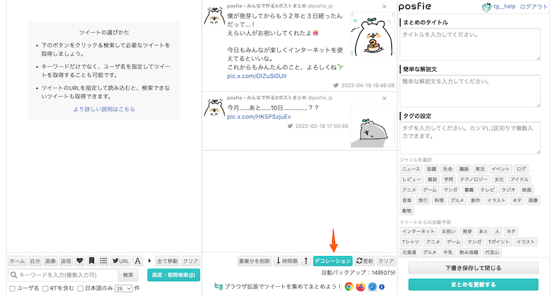まとめ作成画面の画面中央下にある「デコレーション」ボタンをクリックするとデコレーションの設定画面が開きます。