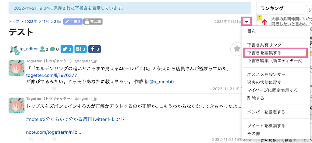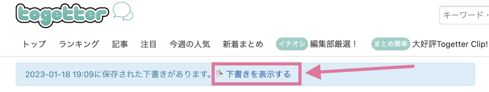 公開済みのまとめを下書き保存した場合は、まとめ上部の「下書きを表示する」から編集画面に移行できます。