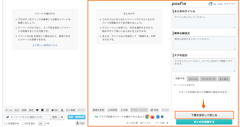 ※まとめ作成画面左カラムの読み込んだポスト(ツイート)などの情報は保存されません。