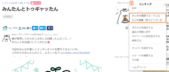 - ページの右上にある「︙」のメニューボタンから「まとめを編集する・デコる」または「まとめ編集(新エディターβ)」のどちらかを選択する