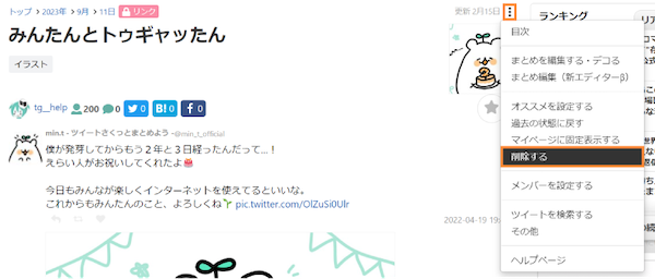 作成したまとめを削除したい場合は、まとめページ右上「︙」のメニューボタンの「削除する」を選択してください。