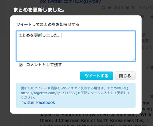公開されているまとめの編集後には、「まとめを更新しました」とポスト(ツイート)とコメントが同時にできる画面が表示されます。文面は変更可能です。