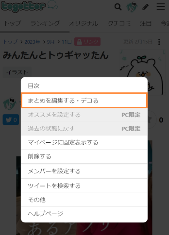 さらに、自身が作ったまとめ以外でも、まとめ作成者によって共同編集メンバーとして設定されているまとめは編集できます。(「公開範囲設定(スマホ)」参照)