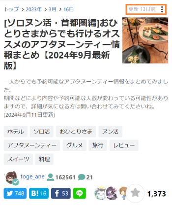 まとめ作成から24時間以上経過した後に編集した場合、まとめページの右上に更新日時が表示されます。この日付をタップすると作成日時の表示に切り替わります。