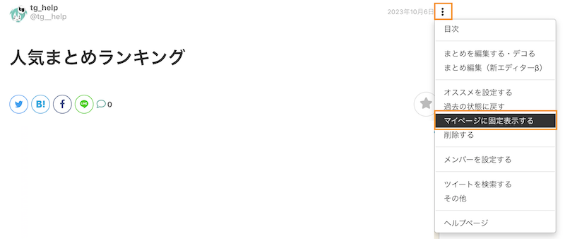 固定したまとめを外したい場合は他のまとめを固定するか、まとめページのメニューボタン「︙」の「固定表示から外す」を選択してください。