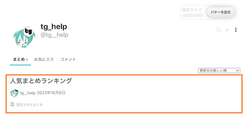ユーザーページのまとめ一覧最上部に固定されます。固定できるまとめは1つだけです。