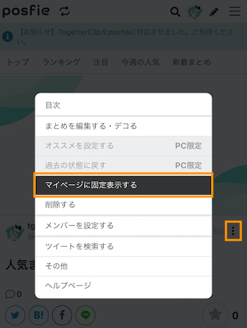 固定したまとめを外したい場合は他のまとめを固定するか、まとめページのメニューボタン「︙」の「固定表示から外す」を選択してください。