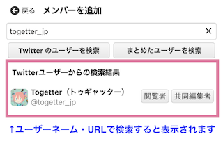 ※まとめ限定公開時のメンバー設定でユーザ検索を行う際はユーザーネームやURLを入力して検索する必要があります。