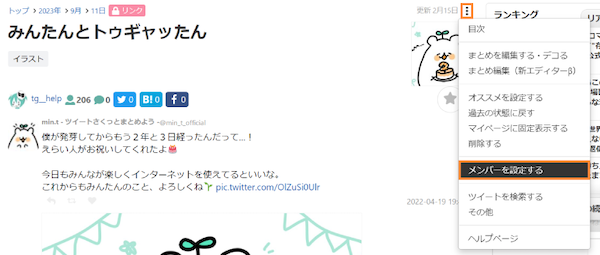 投稿後、作成したまとめページの右上にある「︙」から「メンバーを設定する」を選択すると、閲覧・編集可能なユーザーを設定できます。この設定は「下書き保存」状態でも可能です。