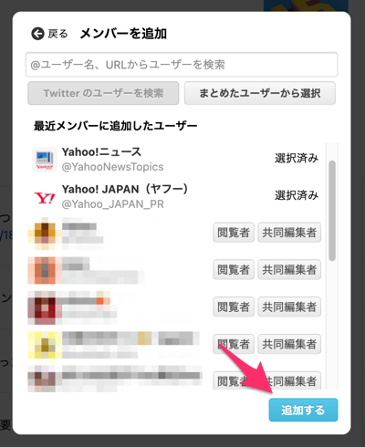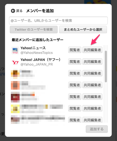 追加したいユーザを検索、「閲覧者」「共同編集者」のいずれかを選択し「追加する」をクリック