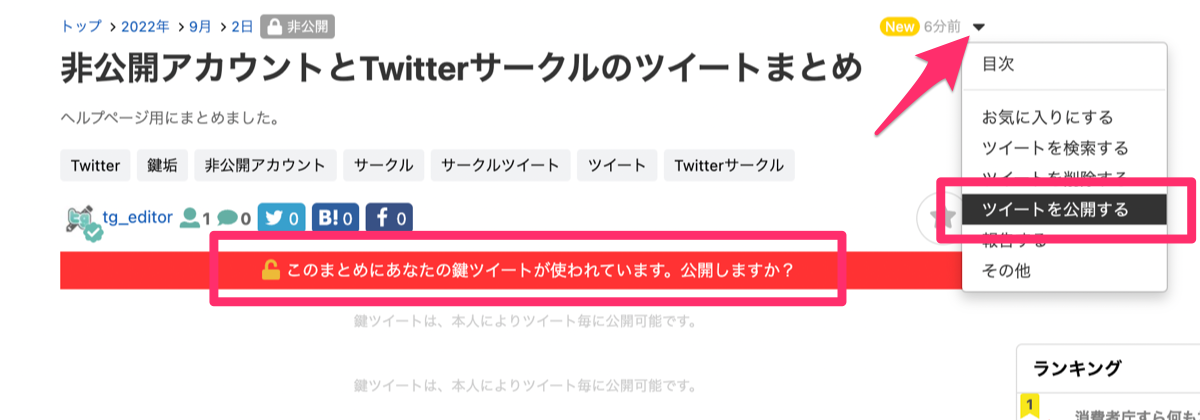 もしくは、該当のポスト(ツイート)が使われているページで「このまとめにあなたの制限付きツイートが使われています。公開しますか?」と表示されるので、そのテキストをクリック