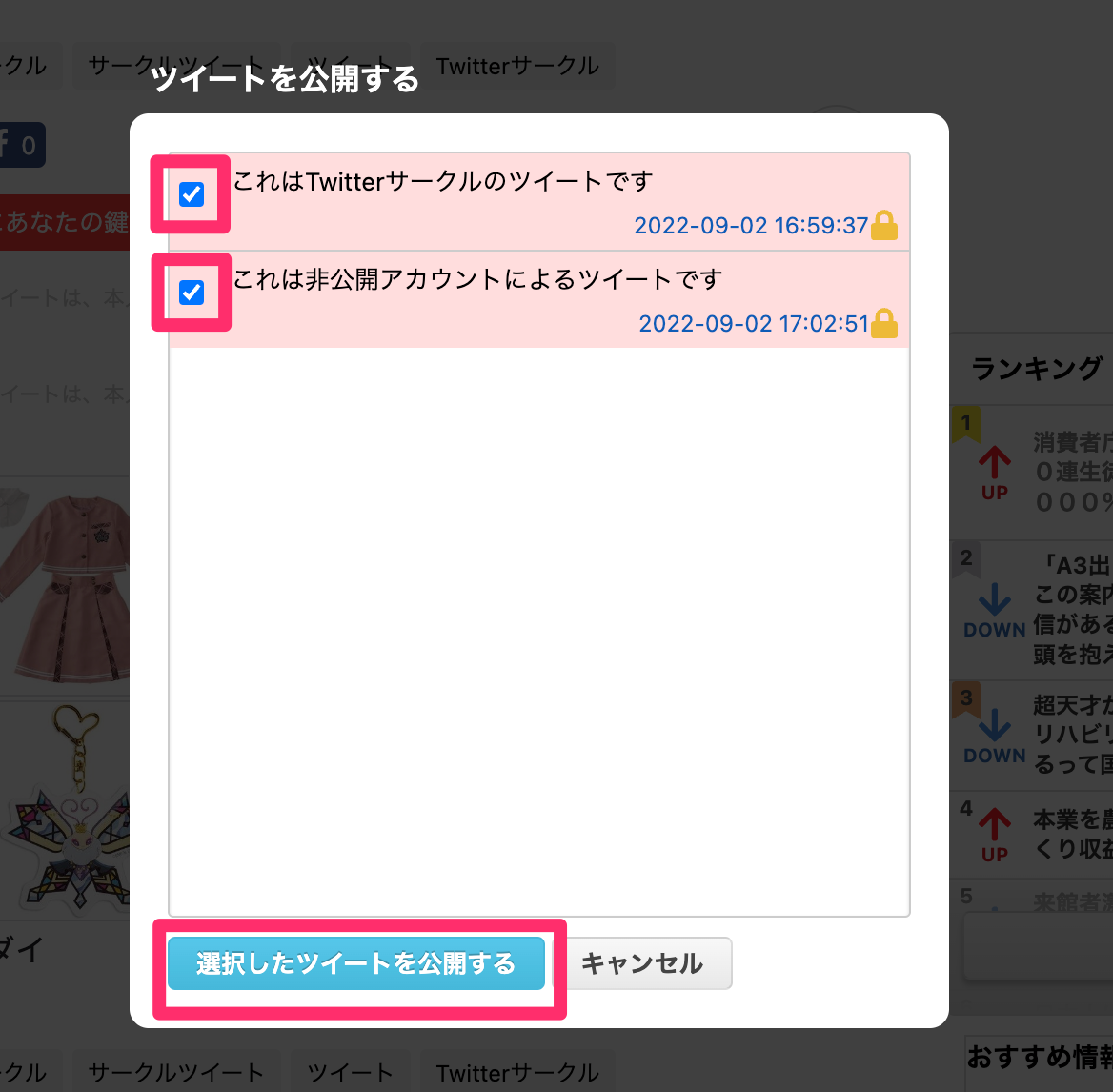 - 公開許可設定画面で、公開を許可するポスト(ツイート)の左側にあるチェックボックスを選択