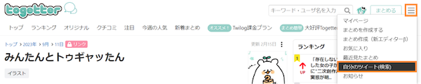 - 右上のメニューから「自分のツイート(検索)」を選択