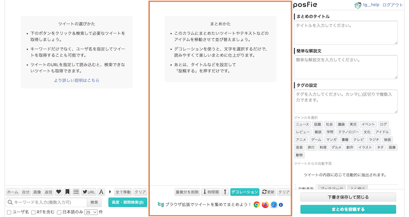 【posfie】まとめ作成に使用したいツイートを取得後、使用できる機能を紹介します。