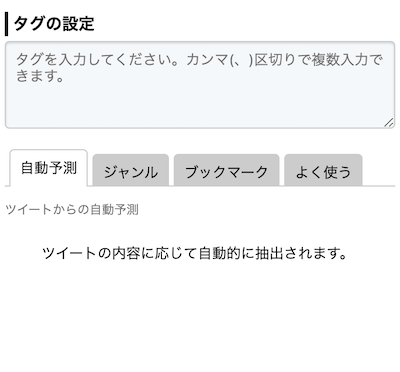 ツイート等のコンテンツを4つ以上含まれ、4秒経過すると自動的にタグ候補が表示されます。予測の対象となるツイートは、先頭から250個までです。それ以上のツイートは考慮されません。
