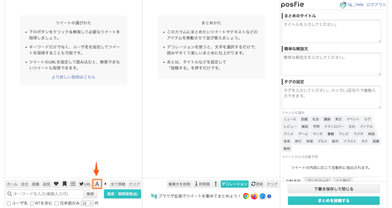 【posfie】まとめには、ツイートだけでなくテキストも挿入することができます。また、Markdownを使うことでボタンにない記述も可能です。