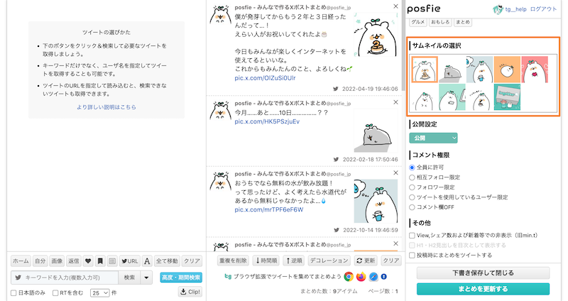 【posfie】まとめのサムネイルは、まとめに含まれる画像の中から自由に設定することができます。サムネイルは変更したり、非表示にすることも可能です。