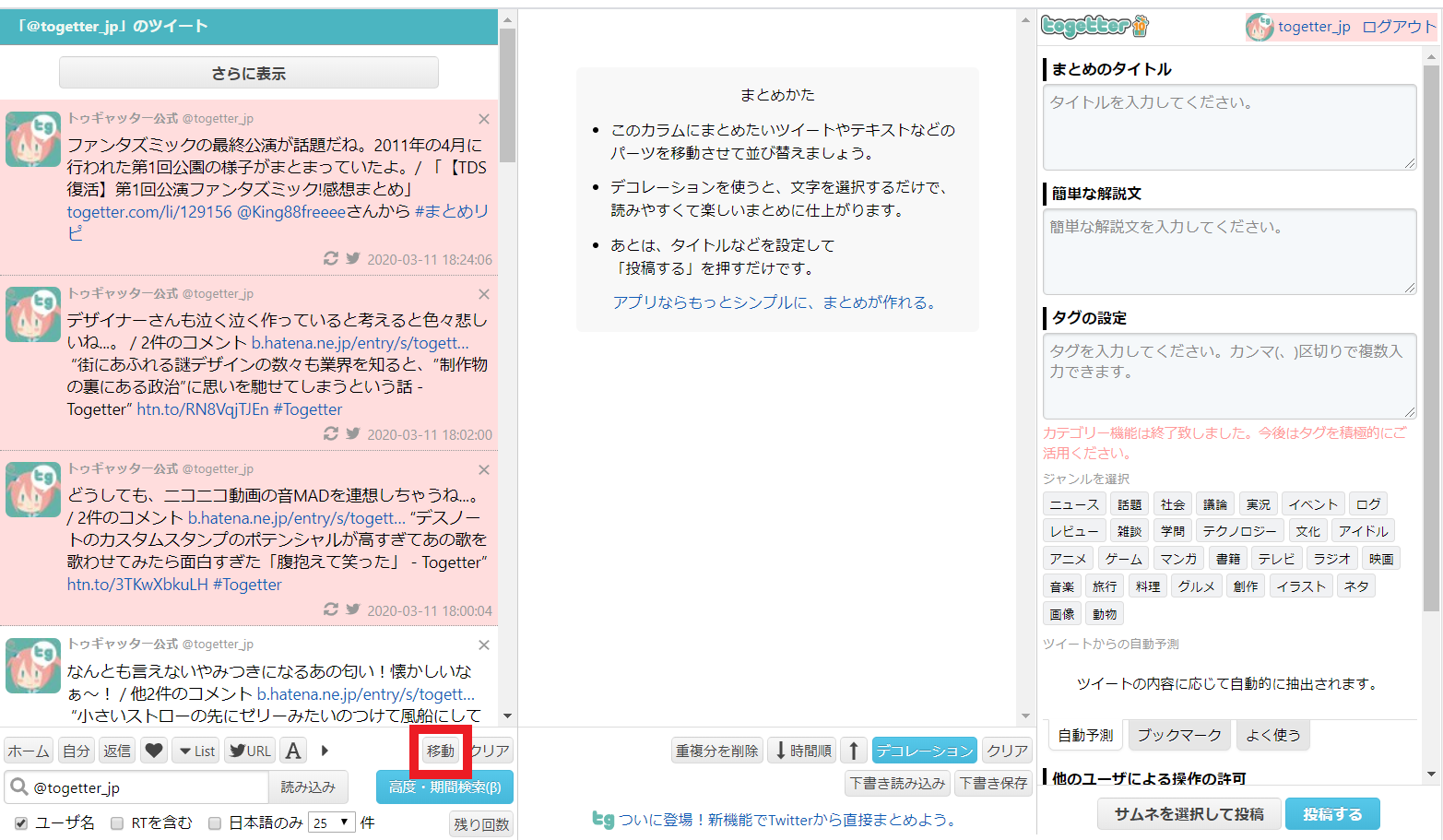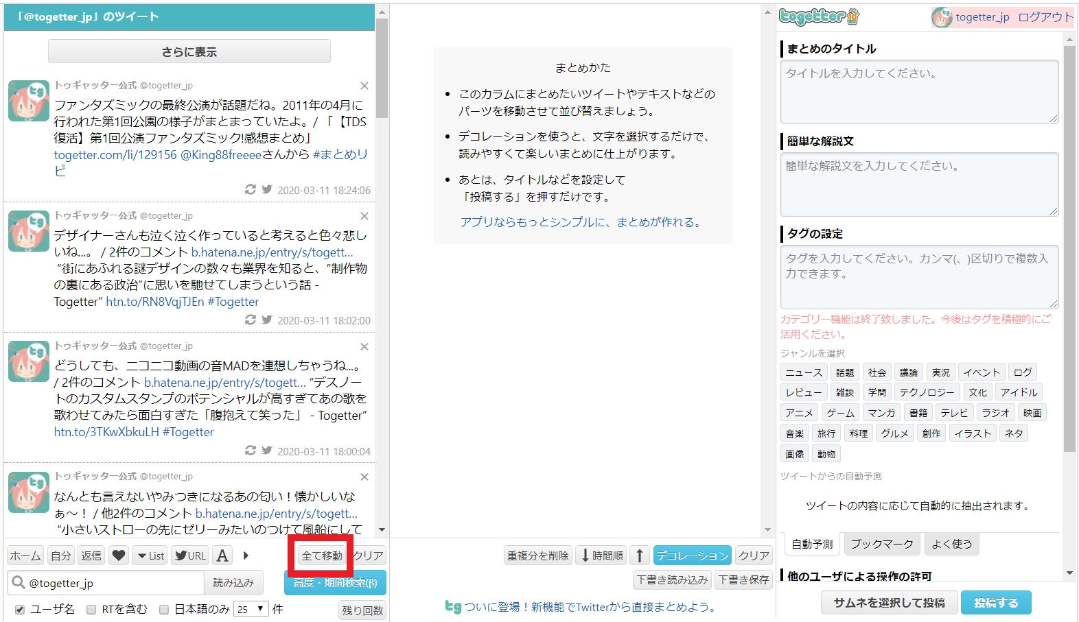 ツイート選択画面で「全て移動」もしくは「移動」ボタンを押さないと、ポスト(ツイート)が並び替え画面に追加されず、投稿ができません。