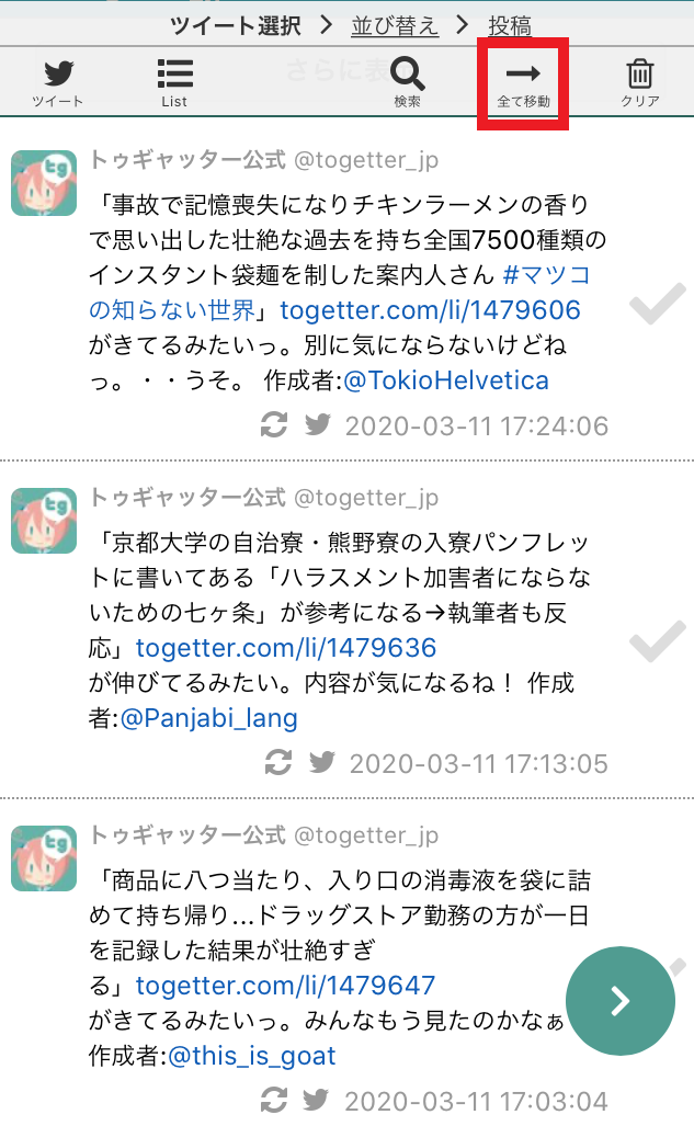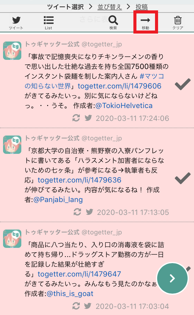 選択したいポスト(ツイート)を右にスワイプすることでもポスト(ツイート)の移動ができます。